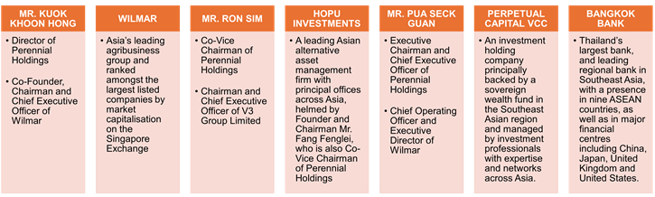 Perennial Holdings’ key shareholders comprise Mr. Kuok Khoon Hong, Wilmar International Limited ("Wilmar"), Mr. Ron Sim, HOPU Investments, Mr. Pua Seck Guan, Perpetual Capital VCC and Bangkok Bank, who have extensive networks and business experience in China, Singapore and other markets.
